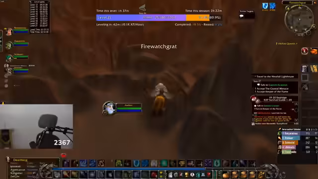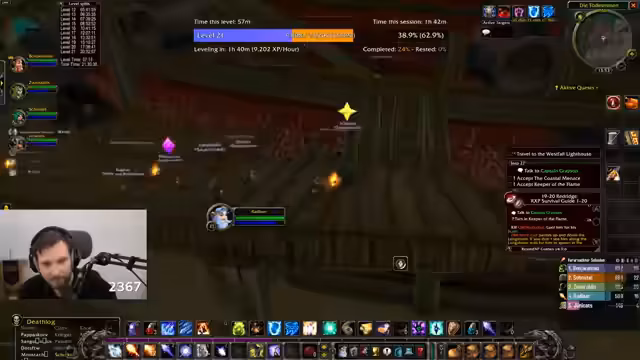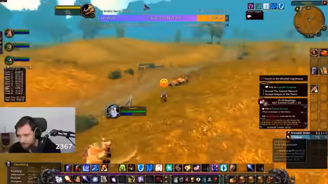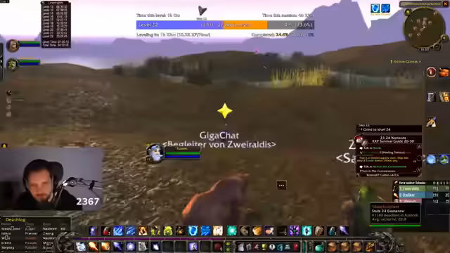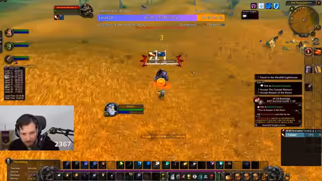 04:38:16Der Fokus liegt auf dem Spiel World of Warcraft, speziell in der Zone Tanaris. Der Streamer versucht, die Quest 'Feuerball!' zu absolvieren, bei der er Feuersteine von Krokodilen sammeln muss. Er ist dabei hart unterlevelt und klagt über die langsame Spawn-Rate und die ineffektive Methode, die Krokodile einzeln zu jagen. Er erwähnt den Wunsch, effektiver durch AOE-Farming zu leveln.