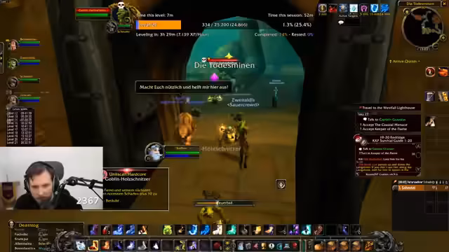 00:13:27Die Gruppe betritt erfolgreich die Todesminen. Das Vorgehen ist zunächst entspannt, da die Gegner im ersten Raum als unproblematisch eingestuft werden. Nachdem die ersten Gegner beseitigt sind, macht die Gruppe eine Pause, um sich erneut zu buffen und auf die bevorstehenden Herausforderungen vorzubereiten. Anschließend kämpfen sie erfolgreich gegen die Vorarbeiterin, wobei der Streamer als Heiler agiert und die Angriffe der Gegner koordiniert.