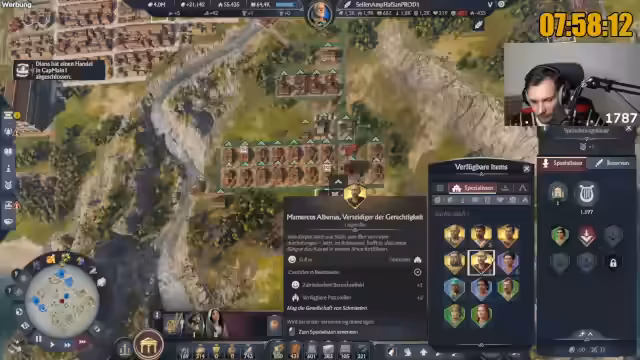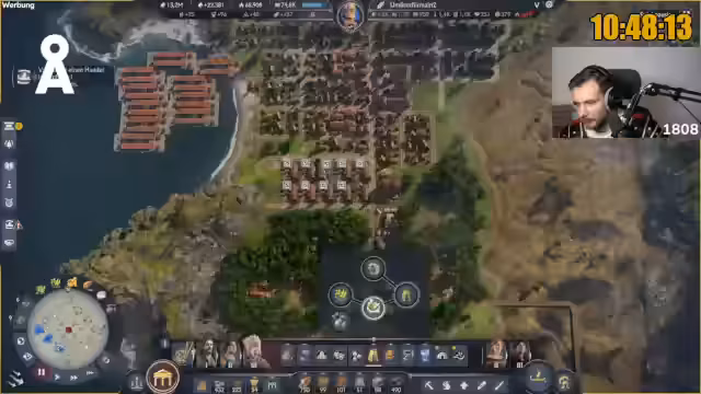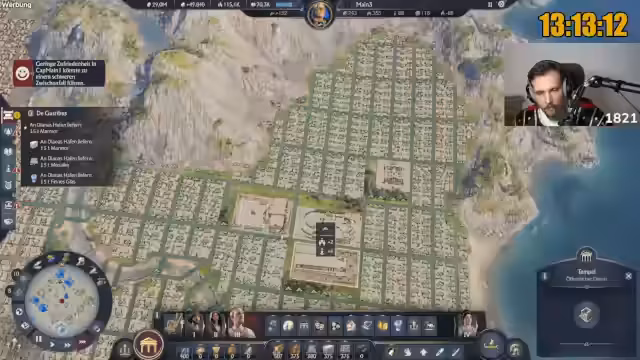 04:39:51Nach rund 11 Stunden und 40 Minuten wird der erste große Meilenstein von 100.000 Einwohnern erreicht. Dies geschah durch den Einsatz von Cetras, dessen lokaler Bewohnerboost als extrem wirkungsvoll eingestuft wird. Der Streamer identifiziert als entscheidenden 'Game Changer', dass Produktionsinseln ohne zugehörige Bevölkerung keine Katastrophen auslösen und dadurch effizienter betrieben werden können, was im Vergleich zur Anno 1800-Demo ein deutlicher Fortschritt darstellt.