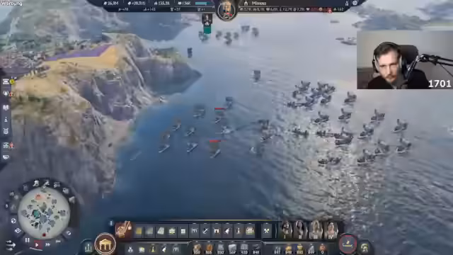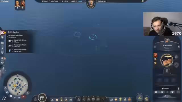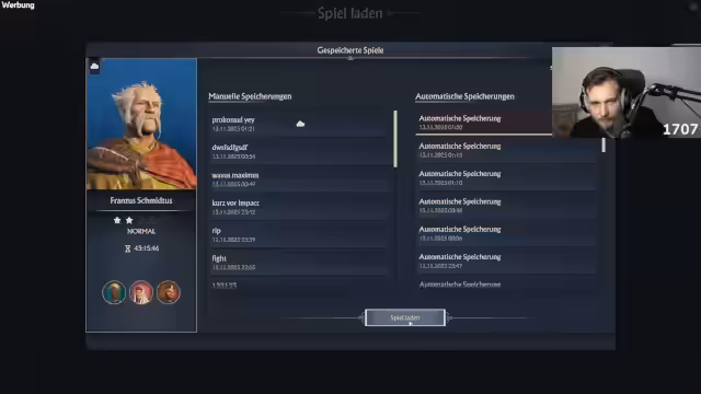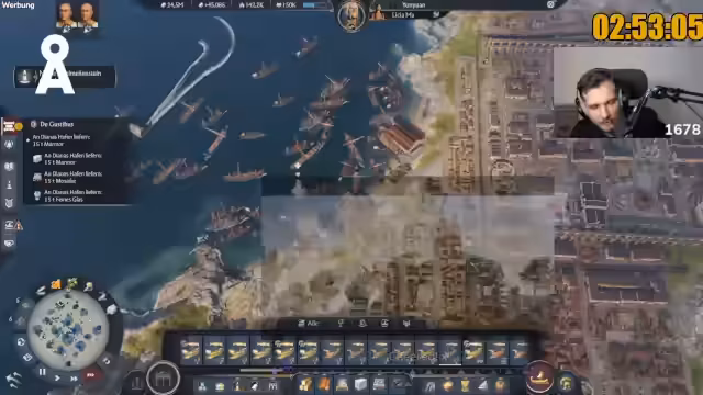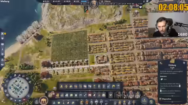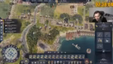 00:10:57Der Streamer widmet sich im Gameplay dem Aufbau einer massiven Militärpräsenz. Er bacht dabei Ressourcen und den richtigen Einsatz von Einheiten, wie zum Beispiel Pretorianern. Er erkundet auch die Vorteile von Spezialgebäuden wie dem Campus Equitum, der die Bevölkerung erhöht, und untersucht die Mechaniken des Schiffbaus und der Truppenrekrutierung. Ziel ist es, eine schlagkräftige Armee aufzustellen, um die computergesteuerten Gegner wie Dorian und Alicia im Testspielstand schnell zu besiegen und die Achievements zu farmen.