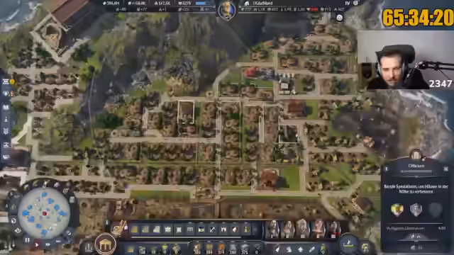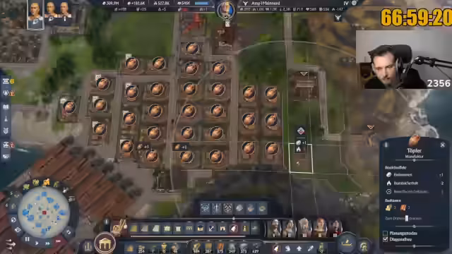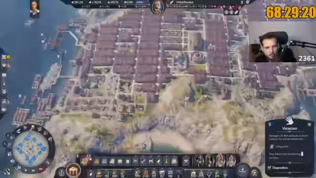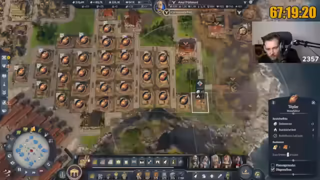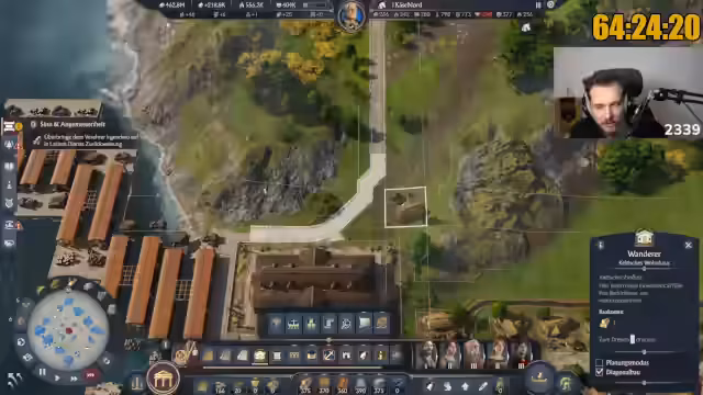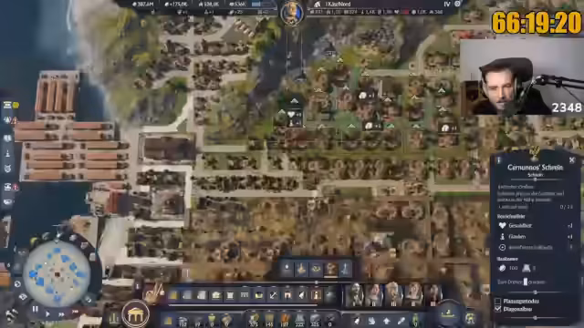 00:42:18Der Streamer kämpft mit ungenutzten Leerfeldern auf seiner Insel, die er nicht bebauen kann, da sie sich an der Schwelle zwischen Schlamm und Gras befinden. Er überlegt, alles höher zu setzen, was aber das Kanalproblem nicht lösen würde. Er lehnt den Bau von Ornamenten wie Latrinen, Brunnen und Wachtürmen ab und empfindet es als furchtbar, Katastrophenschutzgebäude zu platzieren. Er stellt fest, dass Lagerhäuser und Krankenhäuser, entgegen seiner Annahme, individuelle Zugänge benötigen. Er hat eine Umstrukturierung vorgenommen und Bibliotheken für mehr Forschungspunkte platziert, nur um festzustellen, dass dies kaum Vorteile bringt. Trotz über 100.000 zusätzlichen Forschungspunkten hat er lediglich eine Stunde Forschungszeit gewonnen, was die Skalierung der Forschung als ineffektiv erscheinen lässt.