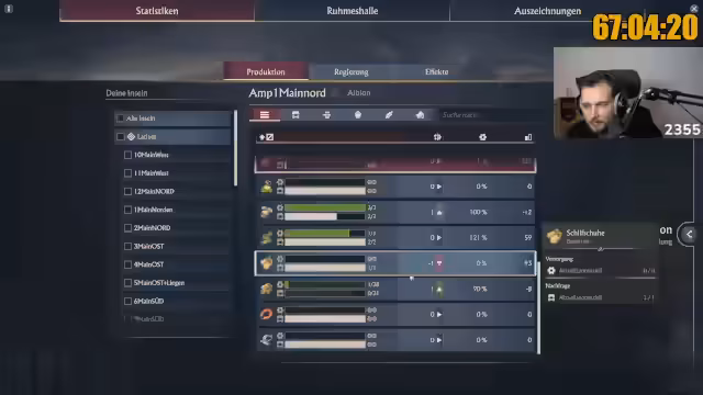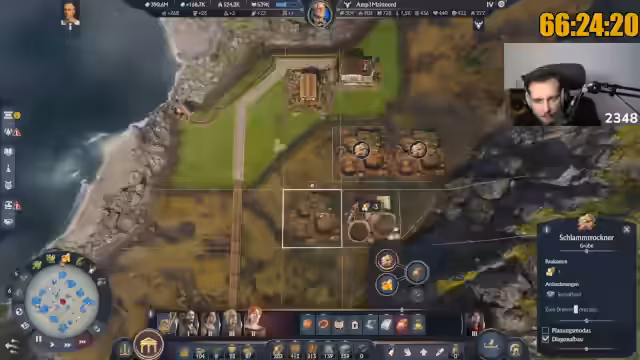 01:22:14Der Streamer gibt an, dass sich auf der betreffenden Insel etwa 2300 Häuser befinden, obwohl eigentlich 2800 Häuser möglich wären. Ein Zuschauer berichtet, 3041 Häuser auf einer ähnlichen Insel gebaut zu haben, ohne nennenswerte Produktionen außer Stören und Schnecken. Dies beeindruckt den Streamer, da er sich fragt, wie er die zusätzlichen 800 Häuser unterbringen könnte. Er kämpft mit einem Bug, der das Spiel zum Neustart zwingt. Er sucht weiterhin nach dem Item 'Meisterin der Molke' für die Käsereien, das 20% Produktivität verspricht, aber schwer zu finden ist. Er erwähnt, dass es einige Items gibt, die nicht funktionieren oder zwar hinterlegt sind, aber nicht gefunden werden können.
