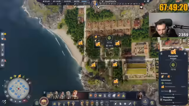00:13:36Die Käseinsel wird als zentrales Projekt vorgestellt, mit dem Ziel, ein Drittel der globalen Käseproduktion zu sichern. Ein unerwarteter Zwischenfall auf der Insel wird kurz thematisiert. Der Streamer erläutert seine Bauphilosophie: Er konzentriert sich ausschließlich auf Gebäude, die Einwohner generieren, und ist dabei sehr wählerisch, da sich nicht alle Optionen lohnen. Aktuell baut er hauptsächlich Käse. Er berichtet von Problemen mit dem Glauben auf der Insel, trotz eines 10%-Boosts von Concordia und einem Tempel. Die Herausforderung besteht darin, auf minimalem Platz zu puzzeln, was er als die reinste Form von Anno empfindet. Er benötigt mehr Wanderer-Arbeitskraft und sucht nach entsprechenden Items, um seine Bevölkerung zu steigern.