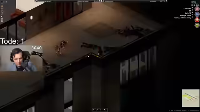 01:41:44Der Streamer gerät in eine gefährliche Zwischenetage und ruft um Hilfe. Er scherzt, dass nur RimWorld gegen die Somboid-Sucht hilft. Nach einer dummen Entscheidung versucht er, alle Zombies zu töten, und sucht nach Munition. Er bemerkt, dass ein Zombie einfach wieder nach Hause gegangen ist. Die Treppen bleiben eine ständige Gefahr. Er hat nur eine Handgun und seine Schuhe als Waffen. Er bedankt sich für die Zuschauerunterstützung und kündigt eine neue Hochhaus-Challenge an. Er freut sich über Twitch-Subs und versucht, Zombies fernzuhalten. Er hat drei Stockwerke geschafft, fürchtet aber, am Gestank zu sterben. Er weiß nicht, wie die Einstellungen der Mod sind, und fragt sich, warum er sich keine Unterhose vor den Mund binden kann. Er ist erschöpft und hungrig und braucht dringend Kippen. Er erklärt die Hochhaus-Challenge: Er muss für den Präsidenten einen Donut aus dem Erdgeschoss holen. Er findet eine Kippe und raucht sie. Er will später Ice Software anschauen. Er findet eine Sporttasche, muss aber nachladen. Er sieht aus wie Trevor aus GTA und isst Beef Jerky. Sein Charakter ist müde und es ist viel los. Er bemerkt, dass der Sound nicht richtig travelt und er jedes Stockwerk einzeln nehmen muss. Er weiß nicht, welche Stats sein Charakter hat, kann aber Antidepressiva essen. Er findet Chewing Tobacco, was er als Glücksfall betrachtet.