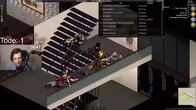 01:58:31Der Streamer findet einen Motorradhelm und eine Schaufel. Er sieht viele Zombies und braucht Waffen. Er findet eine Pistole mit Munition und ist erleichtert. Es gab bisher keinen wirklichen Waffenloot. Er bemerkt, wie blutig alles ist und dass der Geruch ihn langsam tötet. Der Helm schützt nicht vor dem Gestank. Er ist gespannt, wie weit er kommt. Er sortiert sein Essen um und wirft unnötige Gegenstände weg. Er fragt sich, wie viele Kugeln die Zombies fressen. Er muss sich dringend hinlegen, aber glaubt, infiziert zu sein, vom Gestank und den Überresten. Er weiß nicht, ob Instant-Dev aktiviert ist, da es sich um eine Mod handelt. Er fühlt sich sehr unwohl. Er sucht nach einer Waffe, irgendeiner Art von Waffe. Es werden nicht weniger Zombies. Er findet einen Schraubenschlüssel. Er muss die nächsten 36 Stunden überleben. Er überlegt, frische Luft zu schnappen, aber der Gestank geht nicht weg. Er könnte an der Übelkeit sterben. Es gibt insgesamt 31 Stockwerke. Er sieht einen Schwimmring. Er sucht seine Golfkappe. Er fragt sich, ob er jemals die Doppeltreppe überwinden wird. Er vermisst das Waifu-Kissen. Der Boden ist glitschig. Er hat Stärkewerte von 10 bzw. 9 mit Malus. Er findet eine weitere Waffe. Der Boden ist voller Zombies. Er bräuchte eine Nahkampfwaffe. Messer sind Trash. Er wünscht sich eine Brechstange.