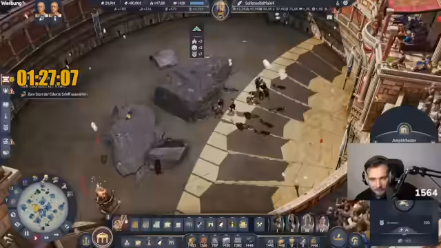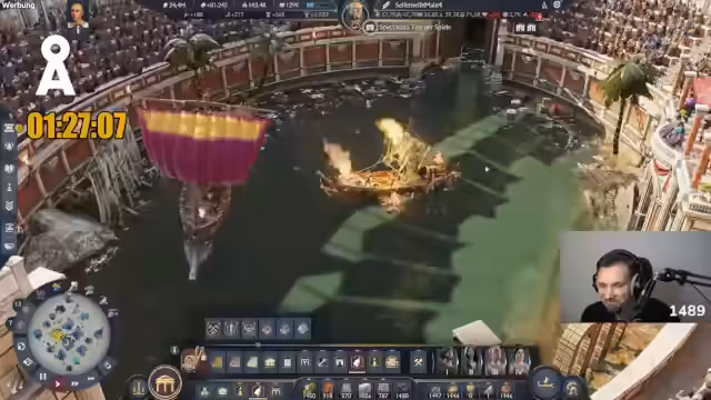 03:45:55Der Streamer wechselt zu einem fortgeschritteneren Spielstand, um das Festsystem im Kolosseum zu demonstrieren. Er kritisiert, dass die Belohnungen für die Spiele nicht krass genug sind und der Boost nur für zwei Stunden wirkt. Ein weiterer Kritikpunkt ist, dass man nur ein Fest gleichzeitig auf einer Insel durchführen kann, was das Potenzial für große Veranstaltungen einschränkt. Er zeigt die Vorbereitung für das Naumachie-Fest und den Beginn der Seeschlachten.