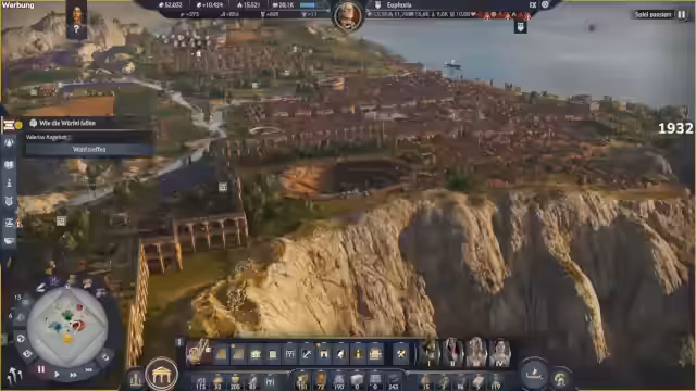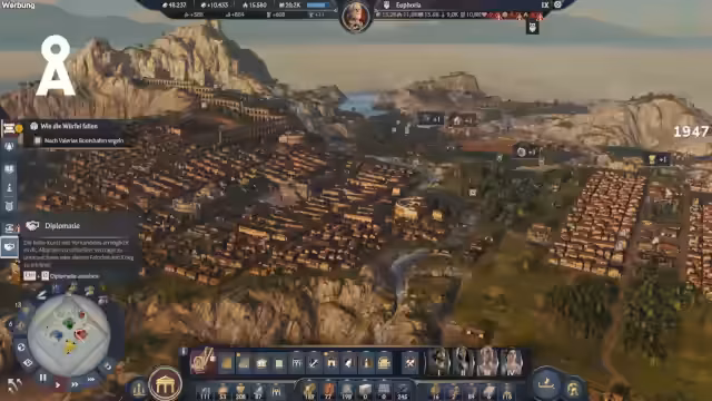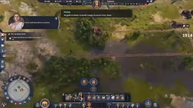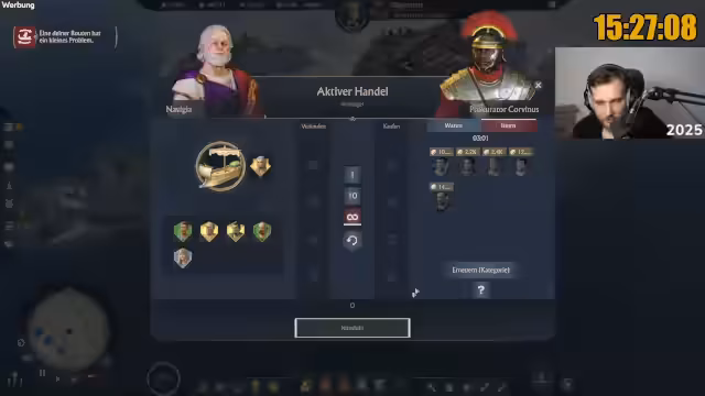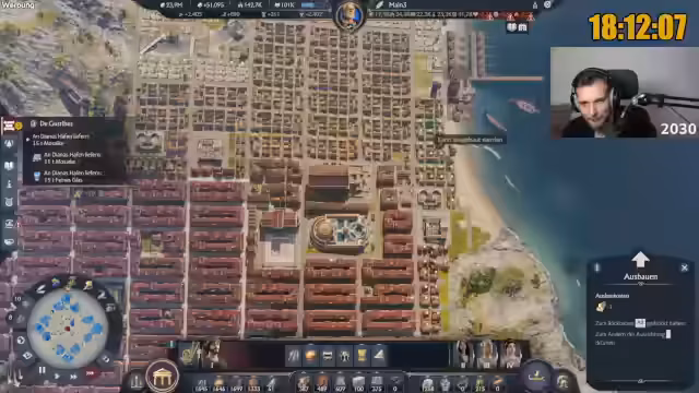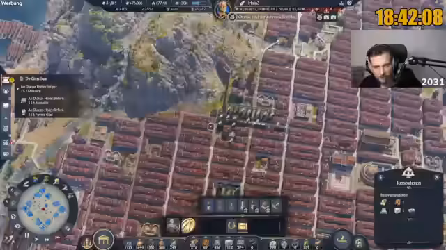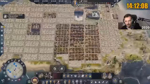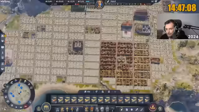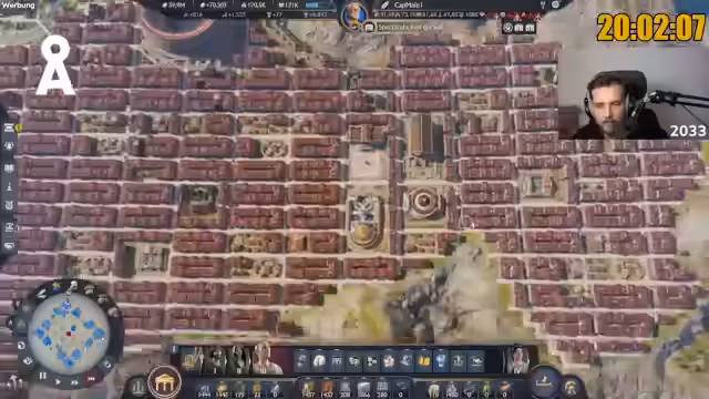 02:39:59Nach der Pause konzentriert sich der Streamer auf die Besiedlung der zweiten Insel und die Auswahl einer Gottheit. Es wird festgestellt, dass Ziegel auf einfacher Geschwindigkeit sehr langsam produziert werden. Der Kaiser verlangt 103 Tonnen Garum, was als unrealistisch angesehen wird. Die Unzufriedenheit der Bevölkerung wird ignoriert, da die Zufriedenheit der Kaiserin (des Spielers) Priorität hat. Die zweite Insel läuft langsam an, aber der Fluss in der Mitte erschwert den Bau von Achterblöcken. Der Verkauf von Hollywood-Produkten dauert lange. Es wird diskutiert, ob es sinnvoll ist, viele Häuser zu bauen, um mehr Einkommen zu erzielen. Ein Medici-Set soll gebaut werden, aber es fehlt an Holz. Der Moderator erwähnt, dass so lange gespielt wird, bis Radlerauge das Kolosseum hat, was Druck erzeugt. Die Spieler diskutieren über die Subjektivität von Spielerfolgen und die Notwendigkeit, Handelsschiffe zu bauen, um Garum und Olivenöl zu transportieren. Die Produktion von Olivenöl ist sehr langsam, und es wird überlegt, Amphoren direkt beim Händler zu kaufen, um Zeit zu sparen.