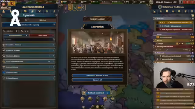 01:35:26Die komplexe Diplomatie von Europa Universalis 5 wird in den Vordergrund gerückt. Der Streamer beobachtet den historischen hundertjährigen Krieg zwischen England und Frankreich und erkennt, dass sein eigenes Land, die Niederlande, einen Rivalen in Utrecht hat. Er versucht, einen Krieg zu provozieren, scheitert aber an den mangelnden militärischen Voraussetzungen. Dies verdeutlicht die Notwendigkeit von Kriegsgründen und die Rolle des internationalen Ansehens in der Weltpolitik.