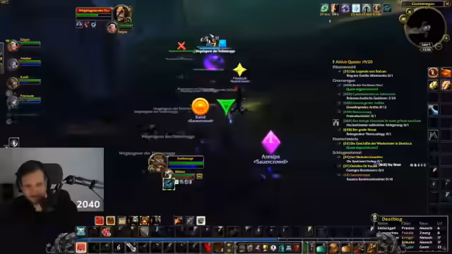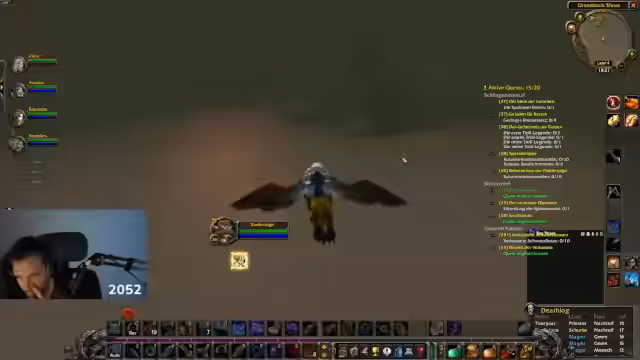 10:08:52Ein neuer Todesfall wird gemeldet: 'Divi' stirbt unter dramatischen Umständen in der Brennenden Steppe, nachdem sie von einer Horde Orks überwältigt wurde. Dies wird als extrem bitterer Verlust empfunden, da die Spielerin kurz davor stand, eine wichtige Stufe zu erreichen. Die Gruppe diskutiert über die nächsten Schritte und mögliche Dungeons für den Abend, während der Streamer versucht, die Koordination trotz der veränderten Situation aufrechtzuerhalten.