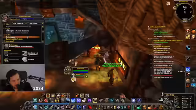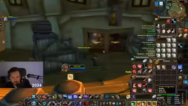 00:02:05Nach dem Betreten der Welt geht es direkt ins Gameplay. Der Streamer kehrt nach Obidin zurück, um Pfeile nachzukaufen und stellt fest, dass er eine neue Ausrüstung – einen neuen Köcher – gefunden hat, die seinen Schaden erhöht. Er spricht über die Verwendung von Seidenstoff und plant, Gegenstände zu verkaufen, um Gold zu verdienen. Er erwähnt das Add-on 'Narzissus', das ihm das Equipment-Level anzeigt und feststellt, dass er mit Level 30 bereits 3,5 Level über dem Durchschnittslevel seiner Ausrüstung liegt.