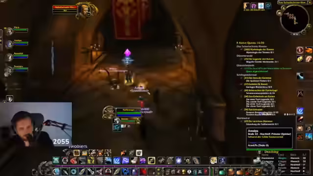 10:56:34Die Gruppe kämpft sich durch die Instanz, wobei der Streamer darauf achtet, alle Mobs aus den Räumen zu ziehen, um überraschende Angriffe von Patrouillen zu vermeiden. Während des Kampfes gegen mehrere Mönche kommt es zu einem unkoordinierten Angriff, was zu einem kritischen Moment führt. Der Streamer muss sich kurz zurückziehen, um seine Lebenspunkte zu regenerieren, und hofft, dass der Rest der Gruppe überlebt. Es werden Drop-Chancen für spezifische Gegenstände, wie eine Kugel oder ein Dolch, diskutiert.