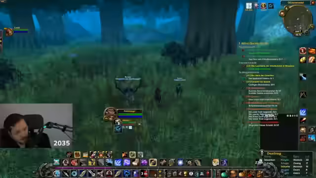 00:14:34Das Team zieht los und beginnt, Mobs im Dämmerwald zu bekämpfen. Der Streamer kauft eine Bronzeröhre, die ihm als Verzauberer nützlich sein könnte, und startet einen Kampf mit einem gefährlichen Mob-Gespann. Es kommt zu einem Double-Pull, der knapp überlebt wird. Nach dem Kampf erhält er eine neue Quest und das Team erkundet weiter, wobei es auf seltene Mobs wie die Spinne 'Weiße Nefaro' achtet. Der Streamer erwähnt einen_disconnect und seine Befürchtungen, nicht rechtzeitig reagieren zu können, was ihn zum Kauf einer USV-Anlage veranlasst.