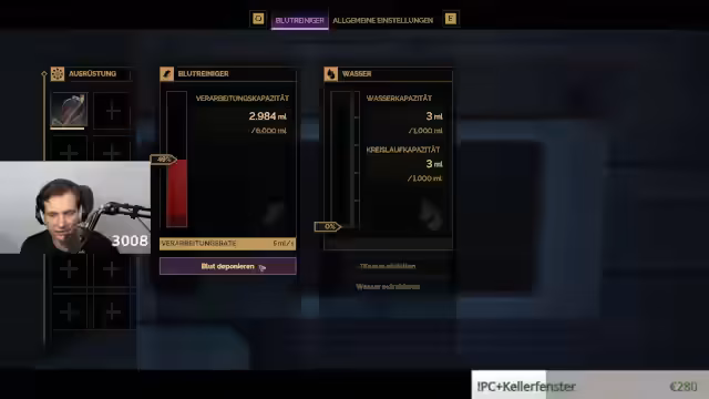 03:48:26Der Versuch, Wasser in die Wasserzisterne einzufüllen, scheitert trotz des angezeigten Befehls 'Wasser einfüllen'. Die Ursache ist zunächst unklar. Stattdessen wird nun versucht, Blut zu extrahieren, was den Bau eines Extraktors oder eines Blutreinigers erfordert. Das Wiegen von Gegenständen und die Frage, ob man manche Dinge nicht wegpacken kann, werfen weitere Gameplay-Fragen auf.