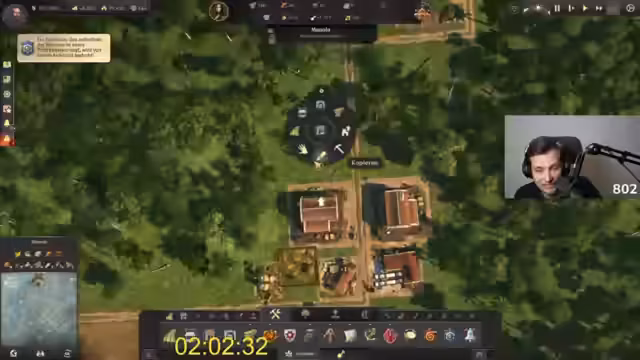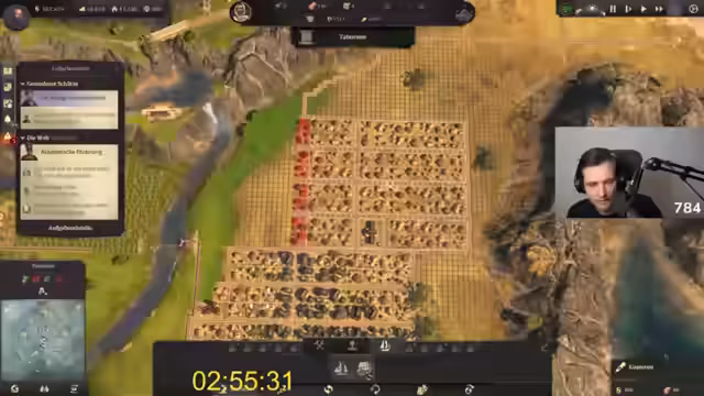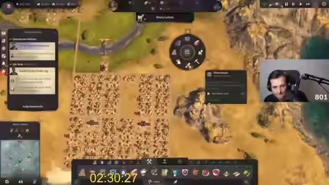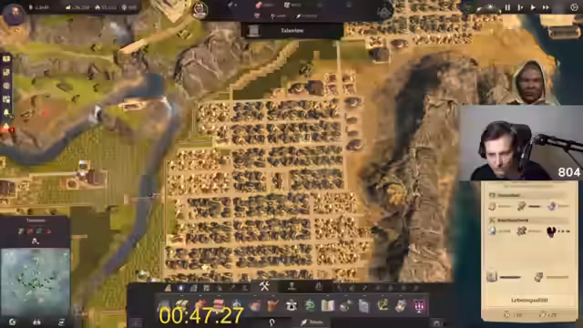 01:00:10Ein seltener Bug führt zu der permanenten Anzeige von Aufständischen, was jedoch die Spielmechanik nicht beeinflusst. Mit rund einer Stunde Spielzeit stehen etwa 2.600 der 33.333 benötigten Älteste. Der Streamer muss nun in einem massiven Produktionssprint die Versorgung für alle Inseln sicherstellen und gleichzeitig schnell weitere Häuser bauen, um das Einwohnerpotenzial auszuschöpfen. Das Zeitlimit wird nun zur großen Herausforderung.