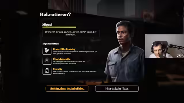 In einem fiktiven postapokalyptischen Szenario wurde die Überlebenschance eines Teams unter extremen Bedingungen getestet. Der Fokus lag auf der Erkundung gefährlicher Orte, dem Management von knappen Ressourcen und dem Bau einer sicheren Basis. Dabei wurden immer neue Charaktere rekrutiert und strategische Entscheidungen für das Überleben getroffen.