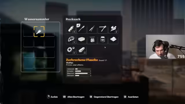 00:01:19Die erste Erkundung führt das Team in eine Bar, die schnell als gefährlich entpuppt, da Zombies vor der Tür lauern. Nach dem ersten gefährlichen Ausbruch aus dem Gebäude beginnt die Suche nach Ressourcen wie Holz, Metall und Nahrung. Bei einem ersten Plünderungszug in ein Haus wird eine beachtliche Menge an Loot sichergestellt. Allerdings ergeben sich erste Probleme mit den Charakterbedürfnissen und der Ressourcenverwaltung.