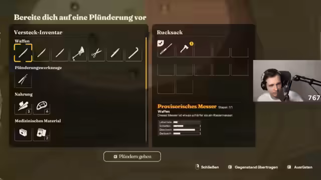 01:42:47Bei der Erkundung einer neuen Location wird der Streamer von einem Kannibalischen Stamm angegriffen, nachdem er versehentlich deren Mann getötet hatte. Die Situation eskalierte, da es keine diplomatische Lösung gab und er sich in Notwehr verteidigen musste. Der Zwischenfall verdeutlicht die moralischen Ambivalenzen des Spiels und die Notwendigkeit, bei der Erkundung gefährlicher Orte vorsichtig vorzugehen, da unvorhergesehene Konsequenzen drohen.