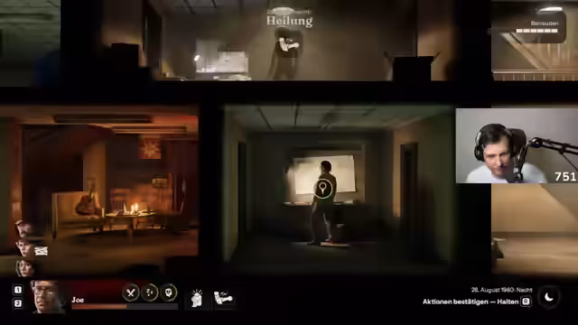 05:47:18Es wird erklärt, dass man in eine Mission reinspawnt und sich darum kümmern muss, dass es den Leuten gut geht, dass sie genug Essen und Trinken haben. Dafür muss man looten gehen, was in dieser 2D-Ansicht funktioniert. Man muss so rumsneaken und gegen Zombies kämpfen. Die Zombies werden angelockt, sobald man mit der Waffe schießt. Sie sind nicht so One-Hit-Zombies wie in Zomboid. Ein Biss killt einen zwar nicht, aber es ist super, super schwer, so ein 2 gegen 1 zu gewinnen. Sie hitten super hart und slowen einen dann auch mit jedem Hit. Die Atmosphäre wird als super cool bezeichnet, so dieser 80er-Style, ein bisschen L.A. Noire, nur mit ein bisschen mehr Licht. Es ist halt noch im Early Access, das heißt, es kommt auch noch eine Menge Content. Es wird gezeigt, wie ein Zombie neben dem Tor chillt und einen angreift, wenn man es aufmacht. Überall, wo irgendeiner in der Ecke hockt, ist halt ein potenzieller Killer. Deswegen muss man immer schön gucken, dass man sneaky-beaky unterwegs ist, wenn es geht. Das Spiel wird als absoluter Überraschungshit bezeichnet. Wenn man aus Versehen mal einen so ein Zombie triggert und der fängt dann an rumzustreien, dann lockt der halt einfach alle an in der Umgebung. Es wird ein Random Z gezeigt, der massiven Schaden macht. Es wird vermutet, dass noch einer auf der Toilette ist. Es wird erklärt, dass es unterschiedliche Kategorisierungen gibt: inaktive und aktive Zombies. Die Kunst ist es halt nur, die aktiven eigentlich wegzureimen. Es wird die Taktik erklärt, dass der eine cleart, der andere lootet. Es wird erwähnt, dass man dieses seltsame Netzwerk finden muss.