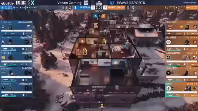 00:49:34Nachdem E-Wave den Score auf 5-0 ausgebaut hat, ruft Votum Gaming einen Timeout, um die Taktik neu zu überdenken. Die Kommentatoren sind sich einig, dass E-Wave bisher das organisierteste und beeindruckendste Team in den Playoffs ist. Ihre Fähigkeit, in wichtigen Runden schnell zu reagieren und Refrags zu spielen, wird gelobt. E-Waves Defense sitzt wie eine Eins und nutzt die Map zuverlässig aus. Votum Gaming findet keinen Weg in das Gebäude und hat auch mit mangelnder Vision zu kämpfen, was die Überlegenheit von E-Wave unterstreicht.