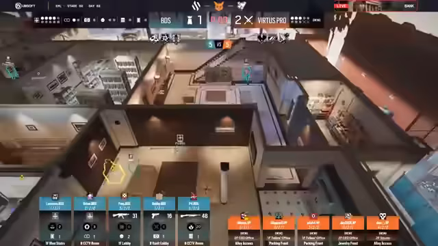 01:54:40Die Anfangsphasen der Runden sind geprägt von taktischen Überlegungen und Unterzahlsituationen. BDS findet sich häufig in 3-gegen-4-Situationen wieder und muss mit einer klaren Rotation und gezielter Utility-Nutzung durch Goyo und Asami versuchen, zurückzuschlagen. Kommentatoren heben die exzellente Zeitmanagement von Virtus.pro hervor, die es ihnen ermöglicht, in Ruhe zu drohnen, Etagen einzunehmen und einen koordinierten Top-zu-Bottom-Clear durchzuführen. BDS konzentriert sich in der Defensive oft auf das Erdgeschoss, was den Angreifern ermöglicht, sich in Ruhe zu bewegen und Druck aufzubauen.