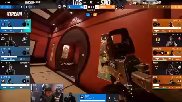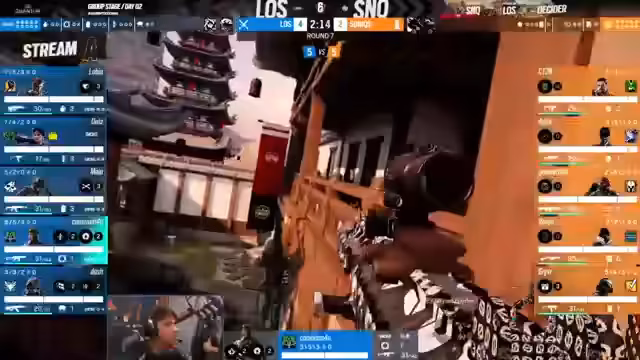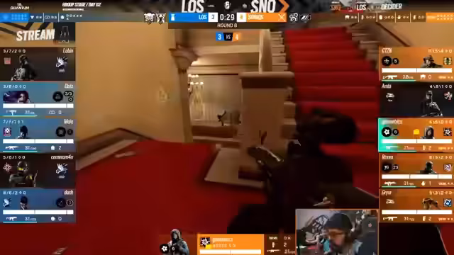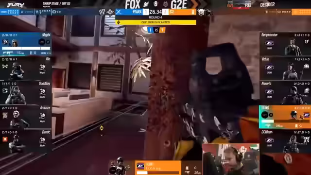 00:40:21Das Match beginnt mit einer starken Demonstration von G2. Das Team zeigt blitzschnelle Aggression, eine exzellente Koordination und nutzt die Utility der Operator effektvoll. Die erste Runde wird flawless gewonnen und das von Furex gespielte conservative Verteidigungskonzept, das den oberen Bereich der Map praktisch leer lässt, wird sogleich als Schwachpunkt identifiziert, den G2 gnadenlos ausnutzt.