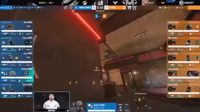 01:01:05M&M Gaming zeigt in der ersten Hälfte auf Map 2 eine beeindruckende Offensivperformance. Das Team agiert sehr koordiniert, sichert sich durch effektives Rotations- und Informationsmanagement mehrere schnelle Runden und führt schnell mit 5 zu 1. Der Kommentar hebt die solide Ausführung der Taktiken und das hohe Selbstvertrauen der Spieler hervor, besonders bei den Entries und im Nachfolguplay.