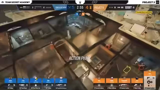 01:43:11Project X startet Consulate mit sehr aggressiven Attacken, um die Informationsvorteile von Secret Academy zu neutralisieren. Ein früher Spawn-Peel-Versuch von Project X zeigt den Willen, früh die Kontrolle über die Map zu übernehmen und zu zeigen, wer den Ton angibt. Gleichzeitig etabliert Secret Academy einen starken vertikalen Spielansatz, insbesondere über die Yellow Stairs, um die Offensivzüge von Project X zu kontern und das Zeitmanagement der Runde zu dominieren.