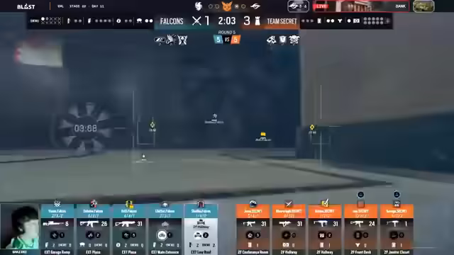 07:05:21Im weiteren Verlauf des Matches auf Clubhouse zeichnet sich ein enges Gefecht ab. Secret erzielt in späteren Runden wichtige Pflanzungen und nutzt Aggression, um die Positionen der Falcons zu überrumpeln. In einer Schlüsselrunde gelingt es Secret, trotz starker Defence durch Falcons mit Adler, Shaiko und anderen, durch einen mutigen Push in die Bombenposition einzudringen und die Runde zu gewinnen. Besonders Shaiko zeigt eine starke Einzelleistung in der Garage, wo er trotz Druck mehrere Kills erzielt, aber am Ende von Secret überwältigt wird. Die Runden werden durch genaues Timing und Utility-Management entschieden, wie das Zerstören von Kaid-Devices und das Pflanzen der Bombe. Die Serie bleibt unentschieden, und beide Teams demonstrieren hohes Niveau, wobei Secret durch konsistente Teamarbeit und strategische Klarheit punktet.