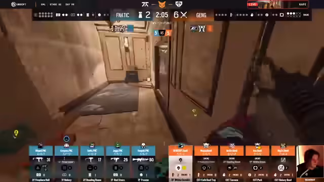 01:01:01Das Spiel beginnt mit einer aggressiven Taktik von Gen.G, die ein Line-Up aus Line und Blitz einsetzen, um früh Druck aufzubauen. Auf der Gegenseite setzen Fnatic auf Utility-Operatoren wie Ezra und Skies, um Flexibilität und defensive Optionen zu nutzen. Jax von Fnatic möchte mehr Tempo auf der defensiven Seite erzwingen, indem er Runouts und Rotationen in Betracht zieht. Dies führt zu einem ersten Duell, bei dem Wizard von Gen.G einen Opening-Pick versucht, während Jax sich zurückzieht.
