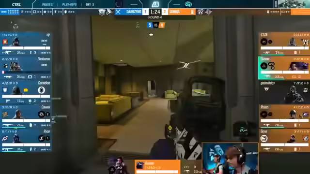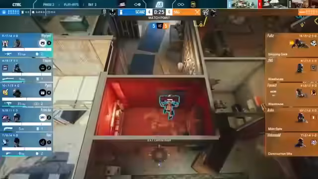 11:46:19Zu Beginn der Runde fokussiert sich Skars auf die Kontrolle der Piano-Position mit dem Operator Asami, während SSG versucht, durch Front Seat-Positionierungen und strategische Drohneneinsätze Informationen zu sammeln. Die Teams legen viel Wert auf Powerpositionen und vertikale Kontrolle, wobei besonders J9O von SSG durch präzise Headshots auffällt. SSG zeigt eine klare Tendenz zu aggressivem Spawnpeaking während Skars eine eher bedachte Vorgehensweise bevorzugt.