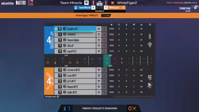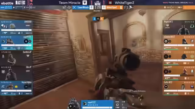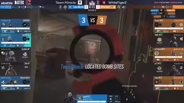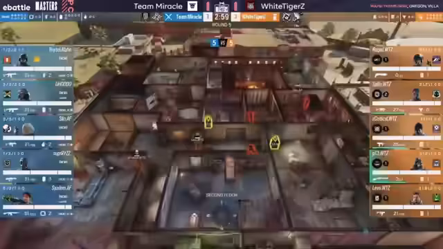 03:16:41Nach dem Round Swap findet sich White Tigers nun selbst in der Angriffsrolle wieder und wählt dafür einen Fokus auf Vertikalität. Ihr Line-up beinhaltet Montagne, Sledge und Bug, um gezielt über den Yellow-Wall-Breach die Topfloor-Verteidigung von Team Miracle zu attackieren. Miracle ihrerseits verteidigt aggressiv mit Oryx und Goyo. Der Versuch von White Tigers, Druck aufzubauen, scheitert jedoch am soliden Verteidiger-Spiel und den cleveren Placements von Team Miracle, was die Runde an die Angreifer geht.