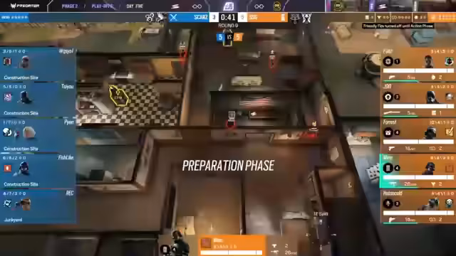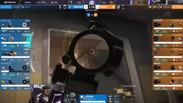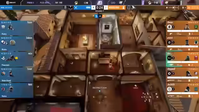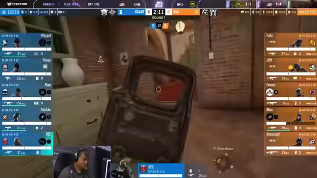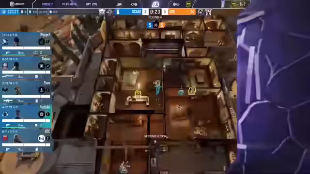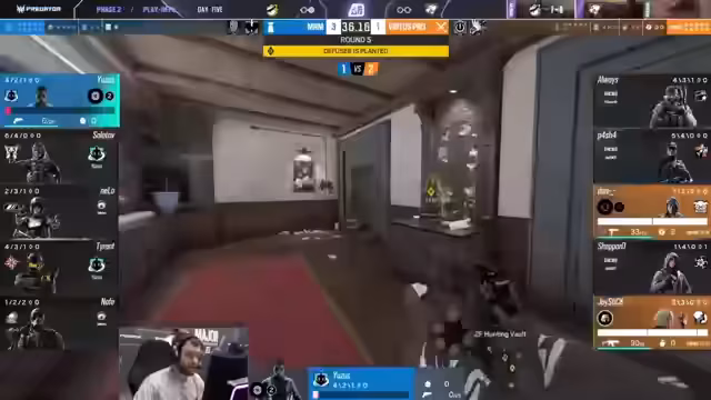 04:15:32Nachdem der Schild entfernt wurde, entsteht eine 2-5-Überzahlsituation für das Angriffsteam. Die Angreifer nutzen dies sofort aus, um sich am Ort des Postplants einzunisten. Verteidiger Shepard ist in dieser Phase sehr aktiv und agiert über die Treppe, um dem Druck standzuhalten. Trotz des klaren Vorteils für das Angriffsteam schafft es die Verteidigung, mit einer cleveren Rotation und dem gezielten Einsatz von Gadgets den Angriff zu zähmen und eine Flawless-Runde zu verhindern.