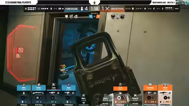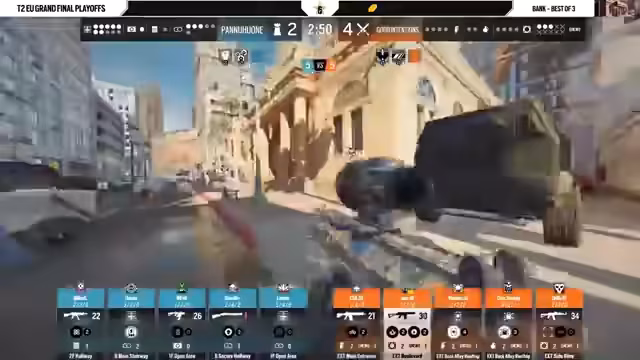 02:00:31In der Schlussphase von Bank versuchen die Angreifer von Panahoune, mit den letzten verbliebenen Ressourcen und der verbleibenden Zeit den entscheidenden Punkt zu holen. Das Fokus liegt darauf, den Verteidigern die wichtigen Sichtlinien zu nehmen und deren verbliebene Gadgets mit der Twitch-Drohne zu zerstören. Nifsu, der mit dem Schild agiert, muss eine riskante Entscheidung treffen, da noch Gegner aktiv sind. Der Ausgang dieser Runde wird den Spielverlauf der gesamten Map drehen und über die Verteilung des Matches entscheiden.