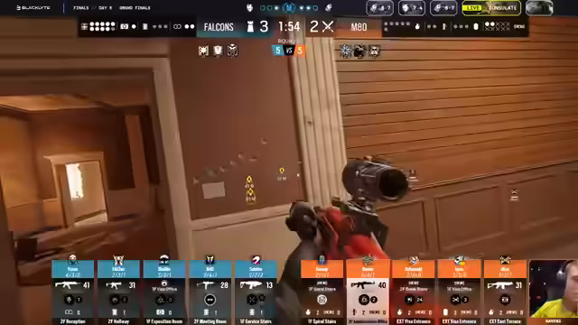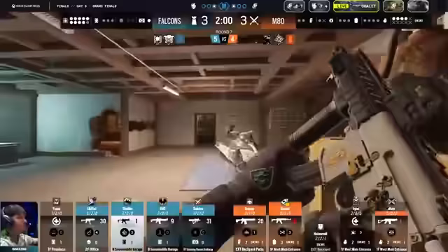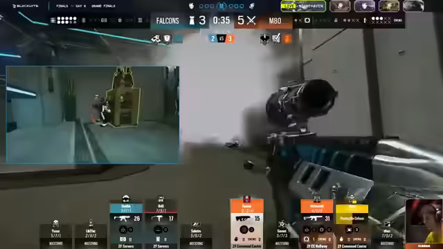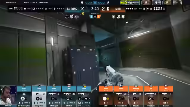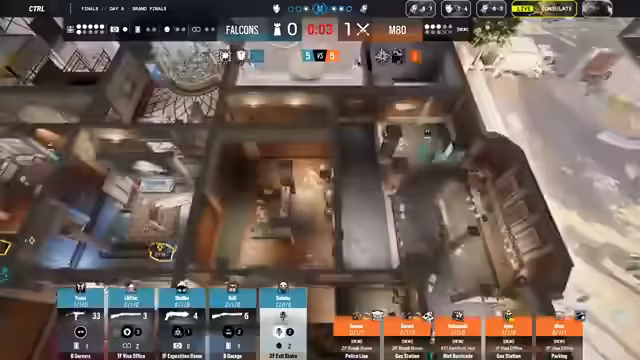 03:31:46M80 setzt auf eine metatechnisch starke Aufstellung mit Glass, Sledge, Capital, Twitch und Thermite, um den Warehouse Breach zu forcieren. Gunner sucht währenddessen gute Positionen, um Rotationen aufzuhalten. Die Drohnenkontrolle von M80 ist sehr effektiv, jedoch auch ressourcenintensiv. Falcons reagiert mit einem verzögerungsorientierten Loadout, das Operators wie Lesion, Mains und Mute umfasst. Trotzdem gelingt es M80, durch aggressive Plays und gute Teamarbeit, wie den Triple Kill von Jusos, die Angriffe der Falcons zu zerlegen. Der Warden beendet eine Runde zugunsten der Falcons, was die Spannung aufrechterhält. Fabian, der Coach von M80, spielt eine entscheidende Rolle, indem er sein Team motiviert und an die Wichtigkeit des Zusammenspiels erinnert. Seine Worte scheinen Früchte zu tragen, da M80 trotz Rückschlägen immer wieder die Kontrolle erlangt und sich auf die Endphase der Runden konzentriert.