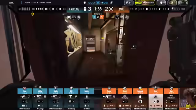 04:19:11Die Falcons zeigen eine beeindruckende Fähigkeit zur Repositionierung und Anpassung an neue Spielsituationen, insbesondere nach der Öffnung der Außenwand, die den verfügbaren Raum auf dem kleinen Spot erheblich einschränkt. Die Kommentatoren heben hervor, wie schwierig es ist, auf diesem Spot zu agieren, wenn der Gegner von unten den Fußboden aufreißt, die IP-Wand offen ist und Crossfire von verschiedenen Seiten kommt. Der normalerweise sichere Bereich hinter der Bar im Office wird durch diese Taktiken unhaltbar. Als Reaktion darauf wird erwartet, dass zukünftig mehr Wert auf das Gegenspiel von unten gelegt wird, insbesondere mit Operatoren wie Solis und Valkyrie, die von dort aus effektiv das V4 denyen können. Diese taktischen Überlegungen sind entscheidend für den weiteren Verlauf des Spiels auf dieser Map.