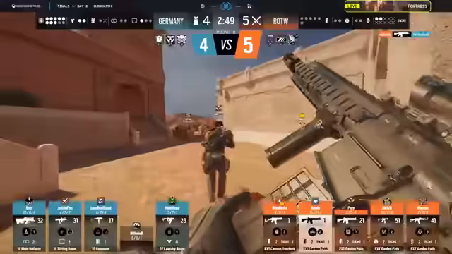 00:31:48Der Championship Sunday in Siege beginnt mit einem aufregenden Show-Match zwischen Team Germany und Team Rest of the World, bevor das große Finale startet. Die Teams, bestehend aus Content Creatorn, werden von den Castern und der Menge begrüßt. Team Germany, angeführt von Keto, Jericho5, Witherboy, Mabossa und Loser-Koeffizient, genießt den Heimvorteil und die Unterstützung der deutschen Crowd. Ihnen gegenüber steht Team Rest of the World mit BikiniBodyBolo, Alicia und Pirates, die ebenfalls starke Spieler sind. Besonders Alicia wird für ihre beeindruckenden 1v5- und 1v4-Clutches gelobt. Das Show-Match wird auf der überarbeiteten Map Fortress gespielt, was neue Herausforderungen und unbekannte Ecken für die Teams birgt. Team Germany hat sich in der Demo-Booth bereits auf die Map vorbereitet und hofft, diesen Vorteil nutzen zu können. Trotz des Show-Match-Charakters ist der Ehrgeiz zu gewinnen hoch, da es um die Ehre und das Prestige geht, vor heimischem Publikum zu triumphieren. Die ersten Runden sind intensiv, mit schnellen Picks und Refrags, wobei Team Germany die erste Runde gewinnt, aber Team Rest of the World mit einer Flawless-Runde kontert.