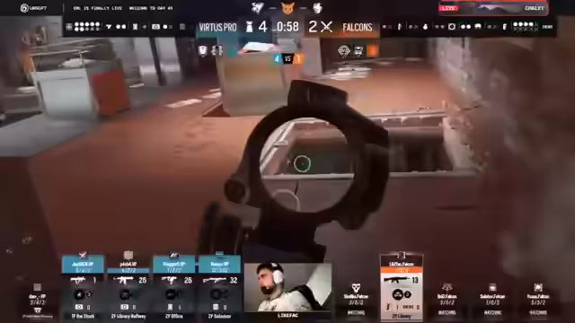 03:51:30Mit nur einer Minute Restzeit steht es 5 zu 1 was die Operator angeht. Virtus Pro erreicht die zweite Flawless Round und geht mit 4 zu 2 in Führung nach sechs Runden. Der Streamer ist beeindruckt von der zwei-minütigen Geduld am Big Window, wobei Virtus Pro einfach abwartet, bis die Falcons nervös werden und reinrennen. Die Falcons zeigen Kontrolleverlust über die Library und schießen sich teilweise selbst über den Haufen, was zu unnötigen Verlusten führt.