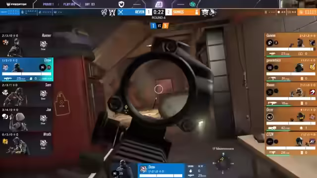 01:02:00Die erste Runde startet im Thronsaal, einem verteidigerfreundlichen Spot. Roaming wird immer wichtiger. Citizen wird früh durch eine Granate ausgeschaltet. Raxxon gleicht mit einem Frag aus. Sonics behält die Oberhand und gewinnt die erste Runde. Die Aggressivität von Sonics zahlt sich aus. Es folgt eine technische Auszeit, möglicherweise wegen eines Headset-Problems bei Citizen. Die Spieler tragen In-Ears für den Spielsound und Over-Ears für White Noise, um Umgebungsgeräusche auszublenden. Die Crowd kommt erst zum Final-Wochenende. Die Play Sheets der Spieler zeigen Aufbauten in der Verteidigung. Die Wahl des Drug Storage Spots ist ungewöhnlich, da er vertikal angreifbar ist. Solis ist ein guter Counter gegen Angriffe von oben. Riven E-Club wählt ein Line-Up mit viel Schadenspotenzial und Nomad zur Flankensicherung.