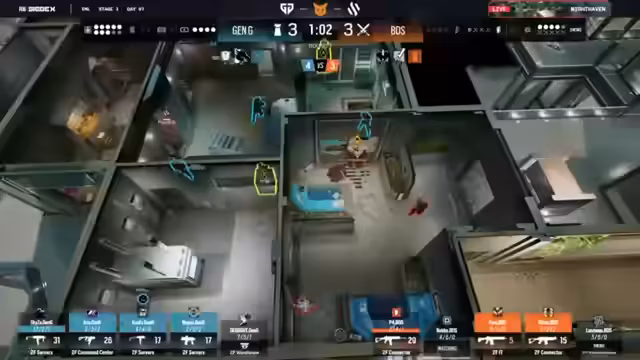 04:27:12Die WDS ziehen sich zurück, mehr ins Basement, während Gen G mit Monty und Ram vertikale Optionen nutzt. Die Roamer können ein Problem darstellen, besonders da Robby im zweiten Obergeschoss bleibt und Lasmo, Virtue und P4 im Erdgeschoss verteilt sind. Im Basement sind nur Frag und Virtue, was Vorteil bietet. Es gibt Utility wie Fnets und Vulcans, die lange zögern können und Monty-Probleme bereiten. Gen G macht Boden mit dem ersten Breach, aber den wird nicht contestet.