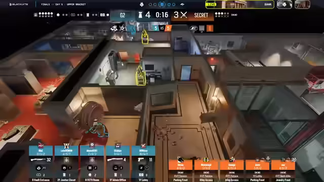 03:53:11Secret startet eine sehr schnelle Attack-Runde, in der Goki und Mowgli schnell Frags erzielen und die Kontrolle über den Tellers- und Parkgalf-Bereich übernehmen. Trotz einer Clash-Drohne von G2, die schnell eliminiert wird, kann Secret die Überzahlsituation nutzen und die Runde schnell für sich entscheiden. Die fehlende Effektivität der Echo-Drohne von G2 wird als Faktor genannt. Secret beendet die Runde mit einem schönen Crossfire und gewinnt die erste Attack-Runde auf der Map. Anschließend wechselt G2 in die Defensive im Basement, wo sie ein 'turtle-heavy' Setup erwarten. Sie nutzen den Tachanka mit seinem LMG für Soft-Destructibility und öffnen oder verstärken Hedges im Obergeschoss, um einen 'Extended Hold' zu ermöglichen. Dies bedeutet, dass sie ausgelagert spielen und die oberen Hedges und Decken geschlossen halten, um Fallback-Möglichkeiten zu schaffen und die Karte breit zu spielen. Secret verfolgt derweil eine Top-to-Bottom-Strategie, um schnell aufzuspielen und Rotationen abzudecken.