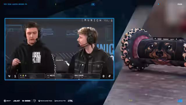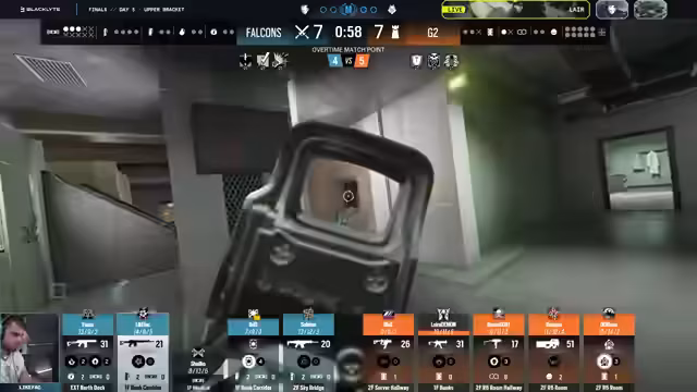 08:54:59Die Overtime beginnt mit einem ungewöhnlichen Spot-Pick von G2: Armory und Weapons. Dieser Spot wird selten gespielt, was auf einen experimentellen Ansatz hindeutet. G2 versucht, mit einer passiven Strategie und Ablenkungsmanövern Damage zu verursachen, aber die Falcons lassen sich nicht darauf ein. Jusos setzt auf der Attack ebenfalls eine Schrotflinte ein. Trotz eines frühen Kills durch Liquidfuck gelingt es G2, die Runde zu gewinnen und die Overtime zu erzwingen. Die Falcons scheinen Schwierigkeiten zu haben, diesen Off-Spot effektiv anzugreifen, obwohl ihr Ansatz, schnell die Side zu nehmen, grundsätzlich gut ist. Die Positionierung von G2 ermöglicht schnelle Reaktionen. Die Clash ist in dieser Overtime-Runde wieder dabei, und die Falcons müssen sich gegen sie durchsetzen, indem sie die anderen Gegner ausschalten. Liquidfuck versucht, vertikal den Breach zu erreichen, aber das Black Mirror und der Mute Jammer verhindern ein Durchkommen. Am Ende gelingt es G2, die entscheidende Runde zu gewinnen und Map 1 für sich zu entscheiden. Stompen und die Clash spielen dabei eine entscheidende Rolle.