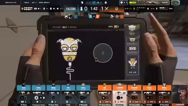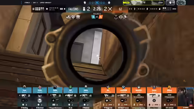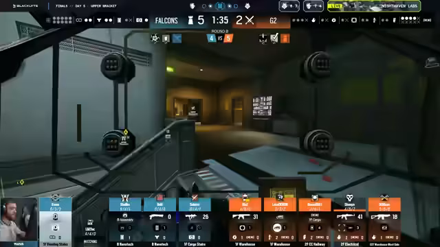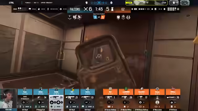 08:45:05Die taktischen Timeouts der Teams offenbaren unterschiedliche Herangehensweisen der Coaches. Während Fabian von G2 eher motivierende und teamorientierte Ansprachen hält, liefert der Coach der Falcons einen detaillierteren Fahrplan mit spezifischen Operator- und Zeitvorgaben. Beide Ansätze haben ihre Berechtigung, und es ist interessant zu beobachten, wie die Coaches mit dem Zeitdruck umgehen. Bei den Operator-Picks überrascht Schalko von den Falcons mit der Brava, einem Operator, der gut gegen Denari eingesetzt werden kann, aber ansonsten eher limitierte Möglichkeiten bietet. Es wird vermutet, dass Schalko hier auf einen sogenannten „Comfort-Pick“ setzt, um mit seiner individuellen Stärke im Damage-Output zu glänzen. Die Falcons nutzen die Brava, um elektronische Utility zu entfernen, obwohl der Gegner nicht viele davon einsetzt, was auf eine flexible Strategie hindeutet. Die Tripwire wird effektiv als Soundbarriere eingesetzt, um das Vorankommen der Gegner zu erschweren. Die Falcons überfahren G2 förmlich in der Defensive, was die Führung weiter ausbaut.