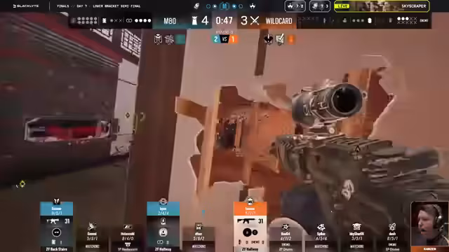 06:05:51Wildcard kämpft sich ins Spiel zurück, nachdem M80 anfänglich dominiert hat. Ein strategisches Timeout von M80 und eine klare Ansage des Coaches Fabian scheinen die Wende einzuleiten. Der Coach fordert seine Spieler auf, ruhig zu bleiben, die Gegner zu lesen und deren Taktiken konsequent zu kontern. Nach diesem Timeout spielt M80 wieder extrem selbstbewusst und organisiert seine Runden effizient. Die Defensive von M80, insbesondere der Gebrauch von Schild-Operatoren wie Montagne und Blackbeard, wird als perfekt im Timing und in der Platzierung gelobt.