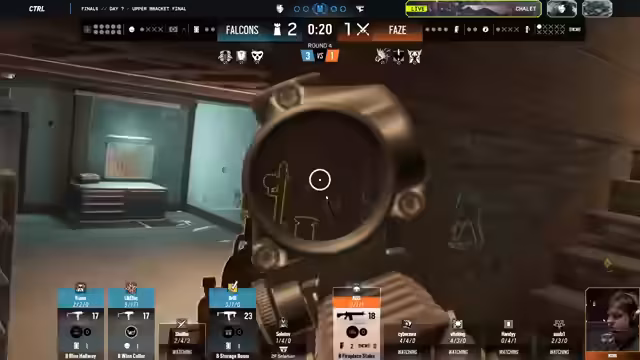 01:20:43FaZe erkennt die Probleme in ihrem langsamen, methodischen Spiel und wechselt die Taktik, indem sie einen Operator namens Blitz für mehr Tempo und Aggression einsetzen. Auch wenn dieser Blitz-Angriff zunächst erfolgreich startet, gelingt es Falcons, die Situation mit starkem Positionsspiel und gezieltem Utility zu kontrollieren. Die Falcons-Defense nutzt explosive wie Affenminen, um FaZes Push zu behindern, und zwingt das Team in enge Flaschenhälse, was für FaZe extrem schwer zu überwinden ist.