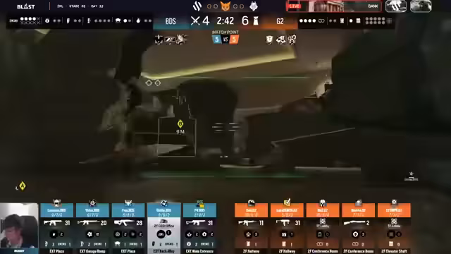 06:07:36In der Map Bank zeichnet sich ein sehr knapper und umkämpfter Spielverlauf ab. G2 gewinnt eine Runde mit nur zwei verbleibenden Spielern, nachdem sie trotz einer anhaltenden Überzahl von BDS durch geschicktes Timing und individuelle Plays entkommen konnten. BDS dominiert in den meisten Phasen der Runden durch Überzahlsituationen, kann diese aber nicht immer in einen Sieg umwandeln. G2s Stärke liegt darin, trotz des Drucks die Runden knapp für sich zu entscheiden. Die Leistung von Spielern wie Blas und Stompton für G2 hebt sich dabei besonders hervor.