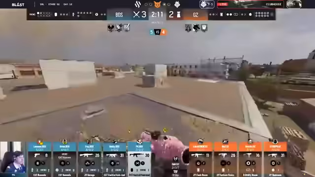 05:34:54Im weiteren Verlauf der ersten Half fällt auf, dass G2s aggressive und unkonventionelle Taktik BDS in Rückzug zwingt. Die Verteidigung von BDS wirkt oft überfordert und kann die schnellen und koordinierten Angriffe nicht parieren. G2s Spieler nutzen ihre Overwells und schaffen es, durch gezielte Öffnungen und schnelle Plays, wie z.B. einen Dropshot von Robby, immer wieder in die Rückzugspositionen der Verteidiger einzudringen. Während BDS in der Verteidigung mit Fehlern wie dem zu schnellen Planten ohne Absicherung auf sich aufmerksam macht, agiert G2 sehr selbstbewusst und aggresiv, was zu einer deutlichen Führung für G2 führt.