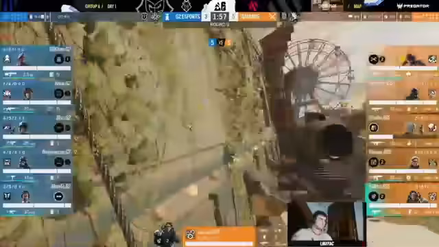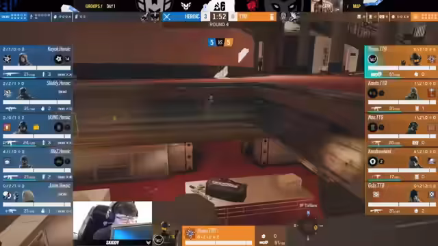 01:07:48Die erste Hälfte des Spiels bestimmte der Kampf zwischen den deutschen Spielern Gisela und Jume. Jume konnte sich im ersten Duell gegen Kanto durchsetzen und die erste Runde für Heroic mit einem weiteren Kill gegen Uno abschließen. In der folgenden Runde fand sich Gisela in einer ungünstigen Position wieder, während Prano vom Jume eliminiert wurde. Die Positionierung von TT9 war zu weit verteilt, was gegenseitiges Support unmöglich machte. Heroic nutzte diese Disziplinlosigkeit aus und dominierte den Anfang des Matches durch klares, taktisches Spiel, ohne unnötige Risiken einzugehen.