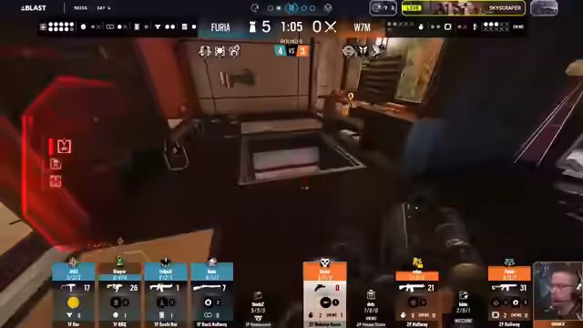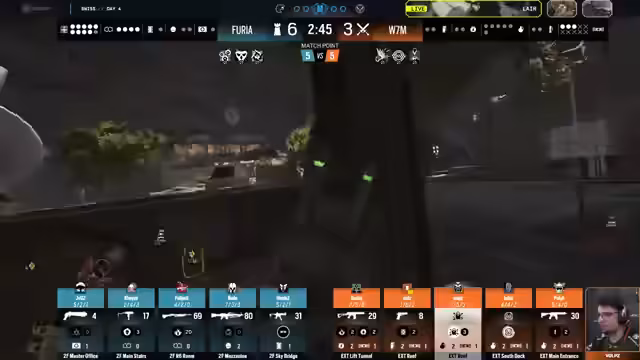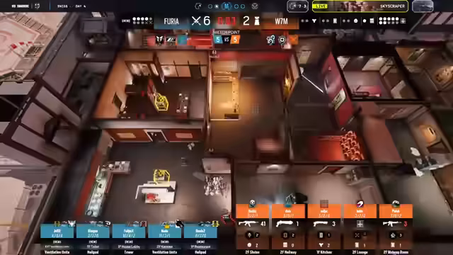 01:43:00Auf Skyscraper erlebt W7M einen totalen Zusammenbruch. Furias Verteidigung ist nahezu undurchdringlich, während W7M's Angriffe planlos und ohne klare Strategie verlaufen. Kommentatoren beobachten, dass W7M das Haus nicht einmal betreten kann, da Furia durch kontrolliertes Holding die Angriffe blockiert und die Gegner isoliert und dezimiert. Das eskaliert zu einer klaren 6-0 Führung für Furia, was für W7M eine fast unmögliche Rückkehr in das Spiel bedeutet. Die fehlende Aggressivität und schlechte Koordination führen zu einem unaufhaltsamen Verfall der Performance.