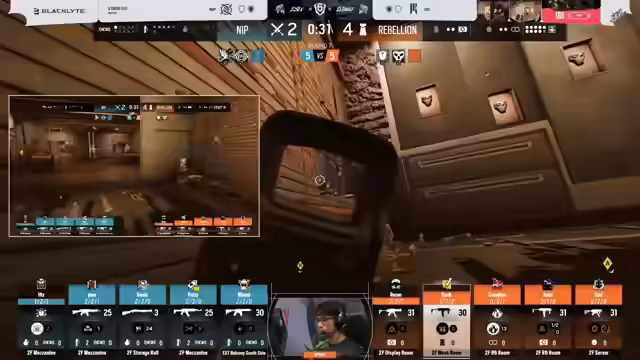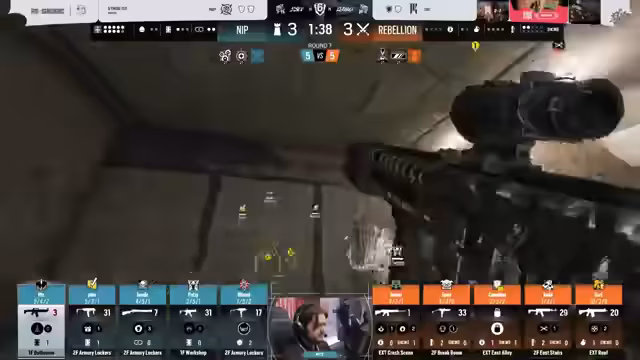 02:13:30Der Map-Spot Armory wird von NIP und Shopify Rebellion gespielt. NIP nutzt dabei einen unkonventionellen Gameplan, beginnend mit Armory, während man normalerweise Tellers wählt. Es kommt zu einem strategischen Kampf um die Kontrolle der E-Stairs. Clash und Hades sind im Einsatz, um den vertikalen Zugang zur Spawnecke zu kontrollieren und den Angriff aufzuhalten. MB setzt sich hier gegen Hades durch und zwingt die Attacker in eine Rückzugsposition. Der Verlust des Support-Spielers in der hinteren Position erfordert eine taktische Anpassung, um nicht ausgepielt zu werden.