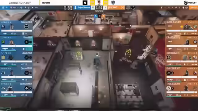 01:59:24Blue Jays zwingen Projekt Nemesis in eine zunehmend hoffnungslose Situation. Sie kontrollieren den Topfloor effizient, nutzen Drohnen für Informationen und nutzen jede Überzahl umsichtig. Der Map-Point wird durch ein präzises Spiel rund um die Bombe gesichert. Die Map endet mit einem klaren Ergebnis für die Blue Jays, was ihre taktische Überlegenheit auf dieser Karte unter Beweis stellt.